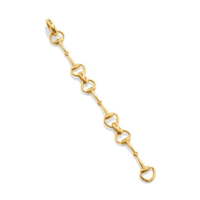 For those who love the majesty of horses, we’ve reinterpreted a classic chain bracelet in equestrian form, featuring interlinking snaffle bits. The first bit introduced to a yearling, the snaffle bit symbolizes gentleness and communication while its radiant gold finish is a reminder that sometimes you have to just jump the fences and blaze your own trail. Timeless, sculptural and chic, this bracelet delivers the perfect dose of glamor and gumption to your favorite pair of jeans or cocktail dress.