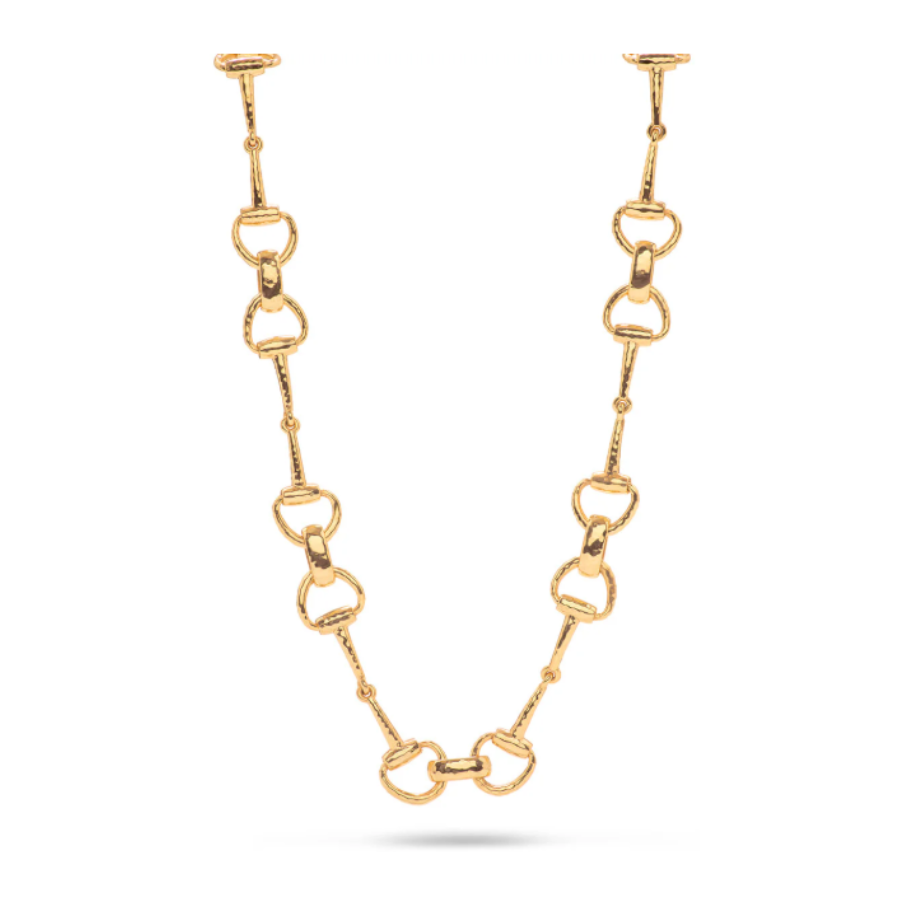 For those who love the majesty of horses, we’ve reinterpreted a classic chain bracelet in equestrian form, featuring interlinking snaffle bits. The first bit introduced to a yearling, the snaffle bit symbolizes gentleness and communication while its radiant gold finish is a reminder that sometimes you have to just jump the fences and blaze your own trail. Timeless, sculptural and chic, this bracelet delivers the perfect dose of glamor and gumption to your favorite pair of jeans or cocktail dress.