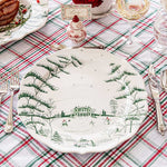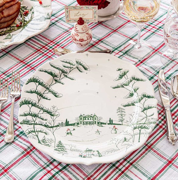 A sprinkling of snowflakes descends upon the country-estate in winter, with intricate illustrations of the Main House in evergreen (and merry pops of crimson accents!) to serve as the perfect backdrop for all your seasonal celebrations. Designed for layering, this charming charger makes a stunning foundation piece for individual table settings and can also be used as a platter.