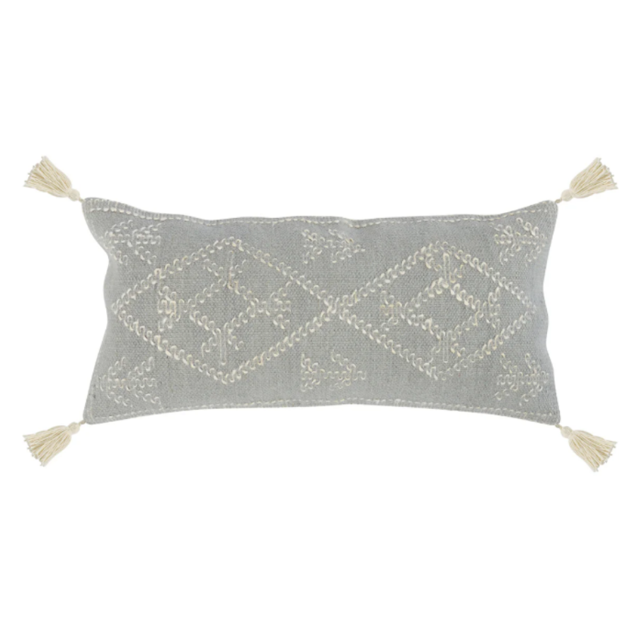 Featuring an understated yet elegant pattern in soft, neutral hues, this pillow infuses timeless beauty into any room. Four corner tassels add a touch of flair and movement to the look.