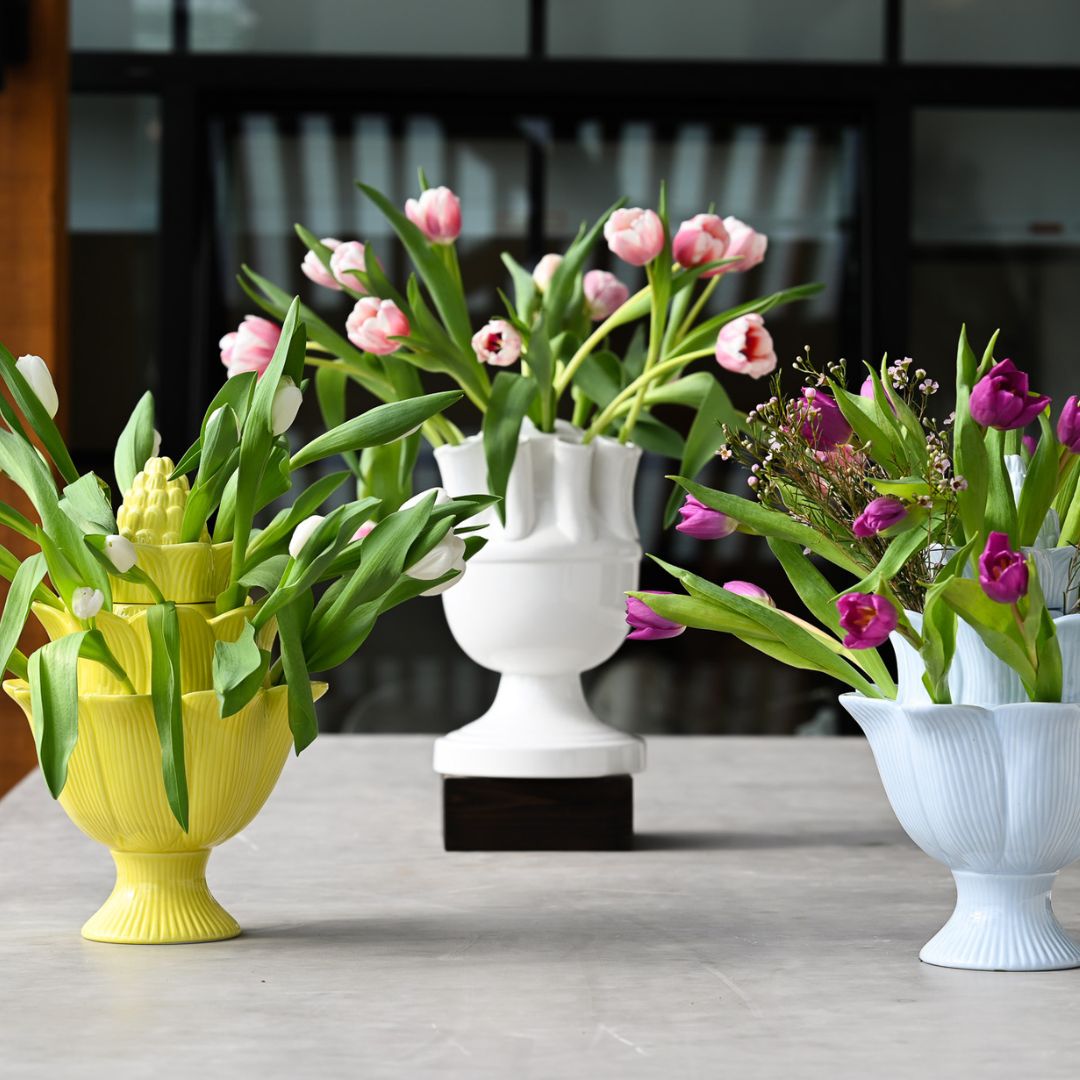 Anyone with a love for flowers would enjoy having this all white tulipiere. This ceramic piece has a removable top for easy cleaning as well as offering additional decorating options.