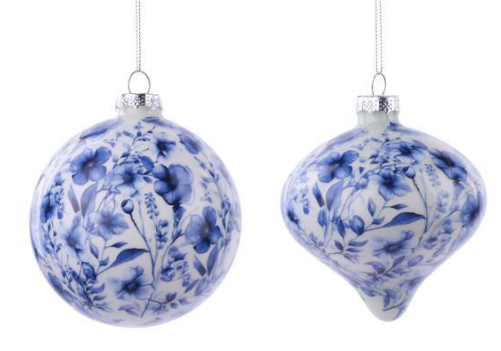 100MM GLOSSY FINISH GLASS SOFT FLORAL CHINOISERIE ORNAMENTS — 2 ASSORTED STYLES: BALL AND ONION W/SILVER CAP AND HANGER SOFT FLORAL: WHITE/BLUE --