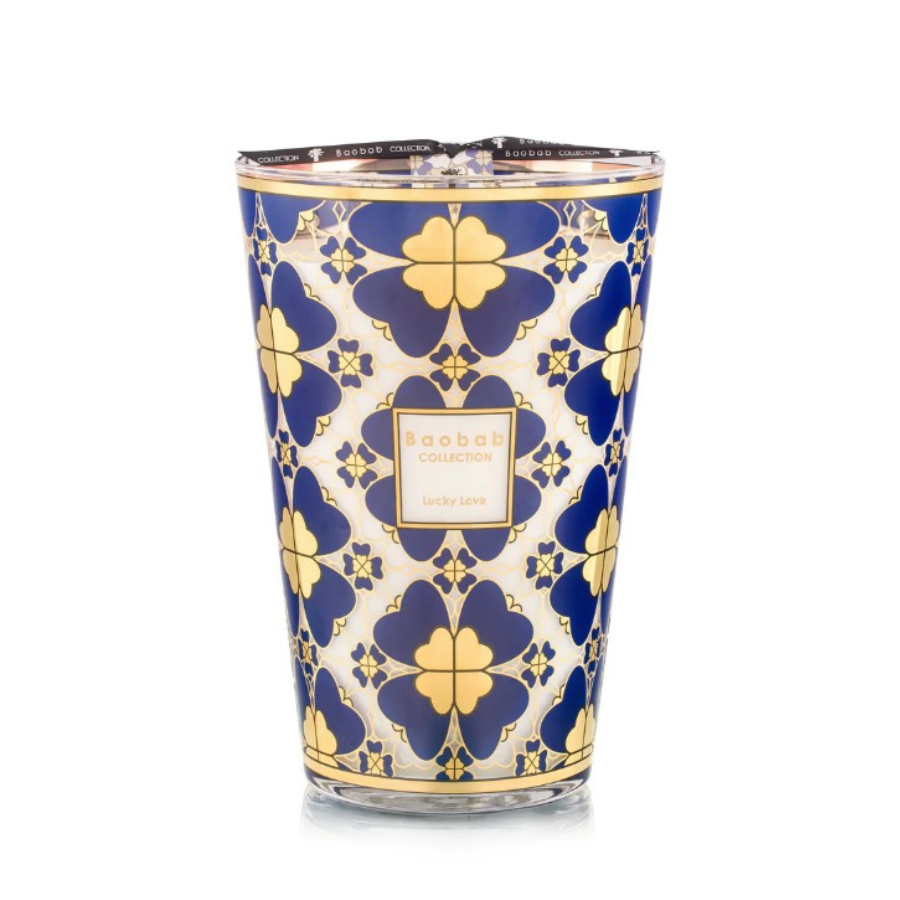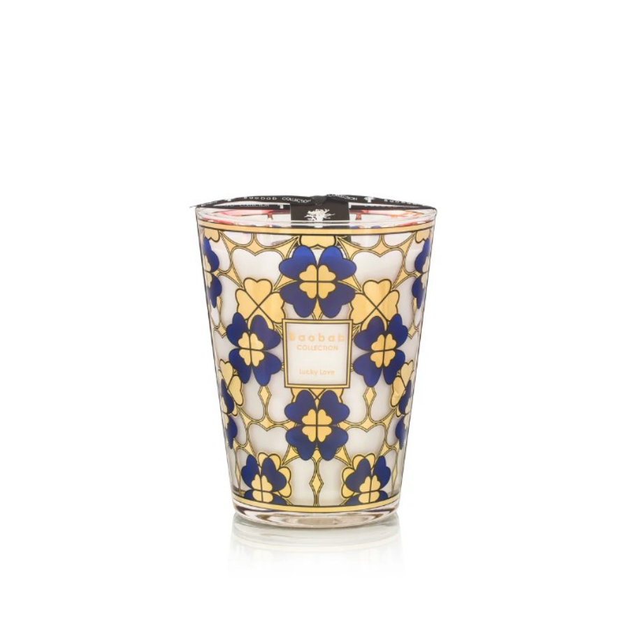 Inspired by a vintage piece of jewelry from the 1960s, the design of the Lucky Love candle features a precious screen print in 24-carat gold and midnight blue. Small hearts come together to form a four-leaf clover.