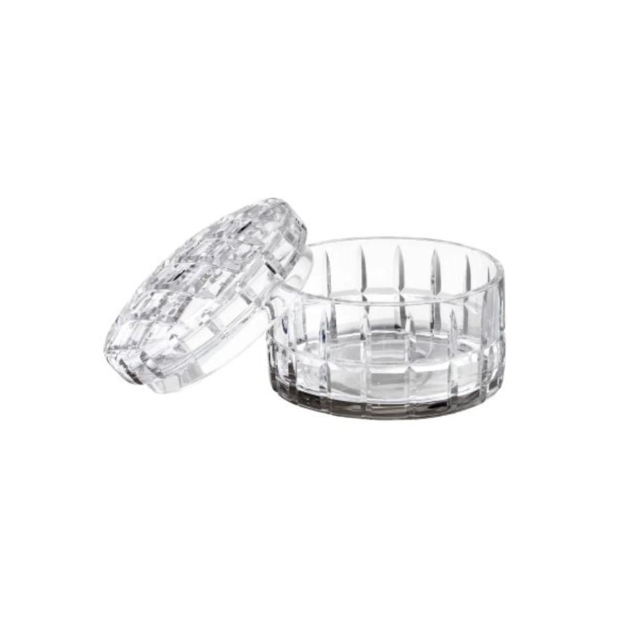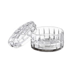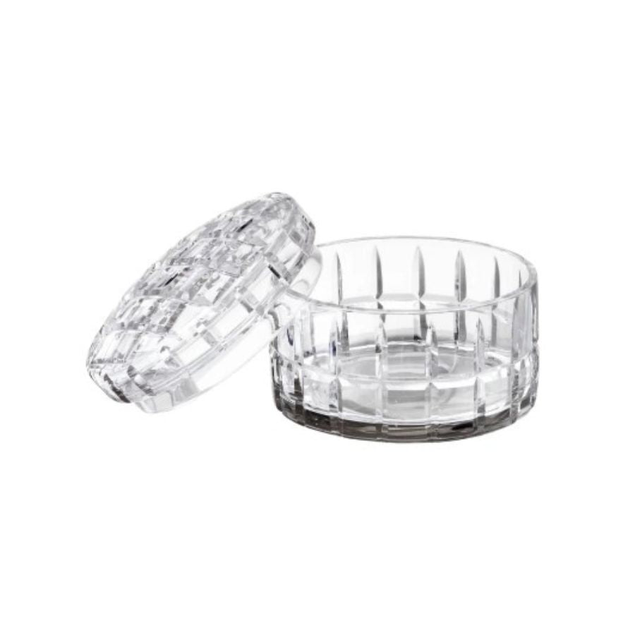 Create added sparkle when serving at the table with the clear glass Rocabar Box. Comprising a round box with lid it has refined designer style and can be used to keep items stored whilst on display or serving. It features a cross hatched deep cut glass pattern created by skilled artisans.