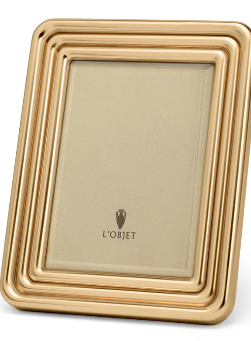 Architectural frame design influenced by Art Deco geometry. Meticulously handcrafted with 24K gold and platinum plating, beveled glass, satin lining and Italian leather and suede backs with beautifully detailed closures.