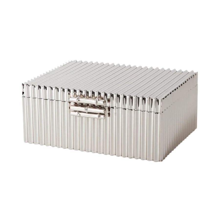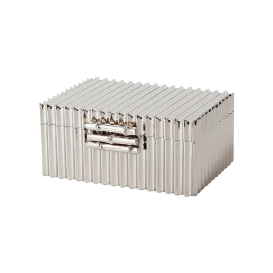These handmade nickel plated solid brass boxes are accented with a bamboo detail. The lids are completely removable. The soldering process is extremely labor intensive to achieve the delicate and perfect flutes that surround this box.