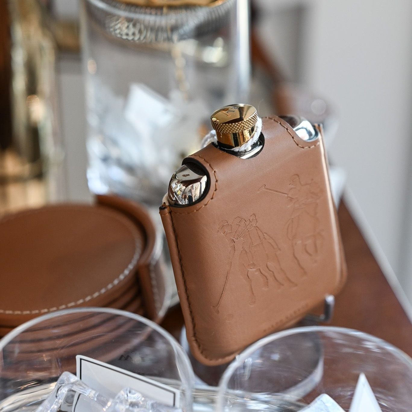 Moisture-wicking canvas, supple leather, and solid brass unite to create the portable Garret flask, a classic bar accessory with refined style.