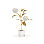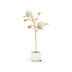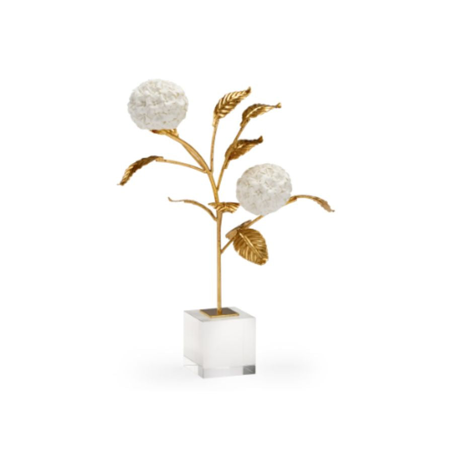 Bring the elegance of nature to your home with this small porcelain hydrangea. Featuring antique gold leaf on iron, the leaves and stem support hand crafted, matte white hydrangea blossoms. A square clear crystal stand braces the delicate hydrangea stem. Beautiful from all sides, this eye-catching accent is ideal for displaying on a cocktail table in any design style.
