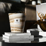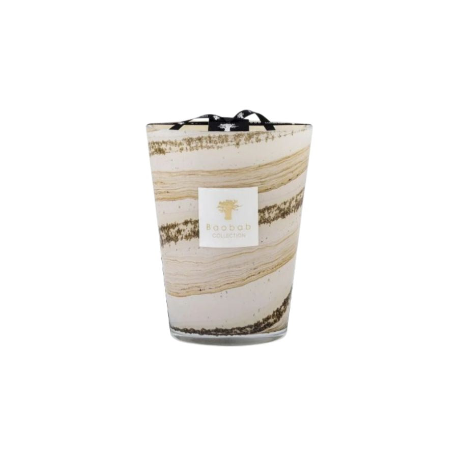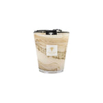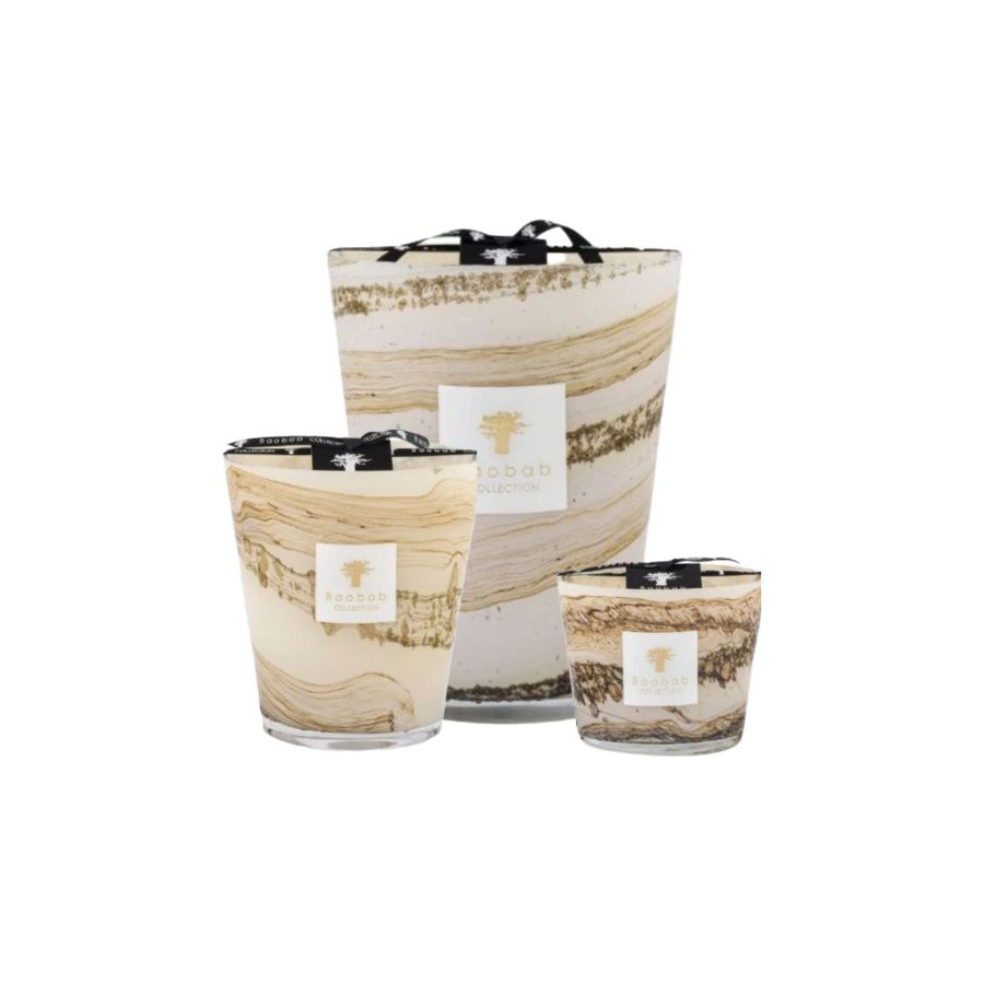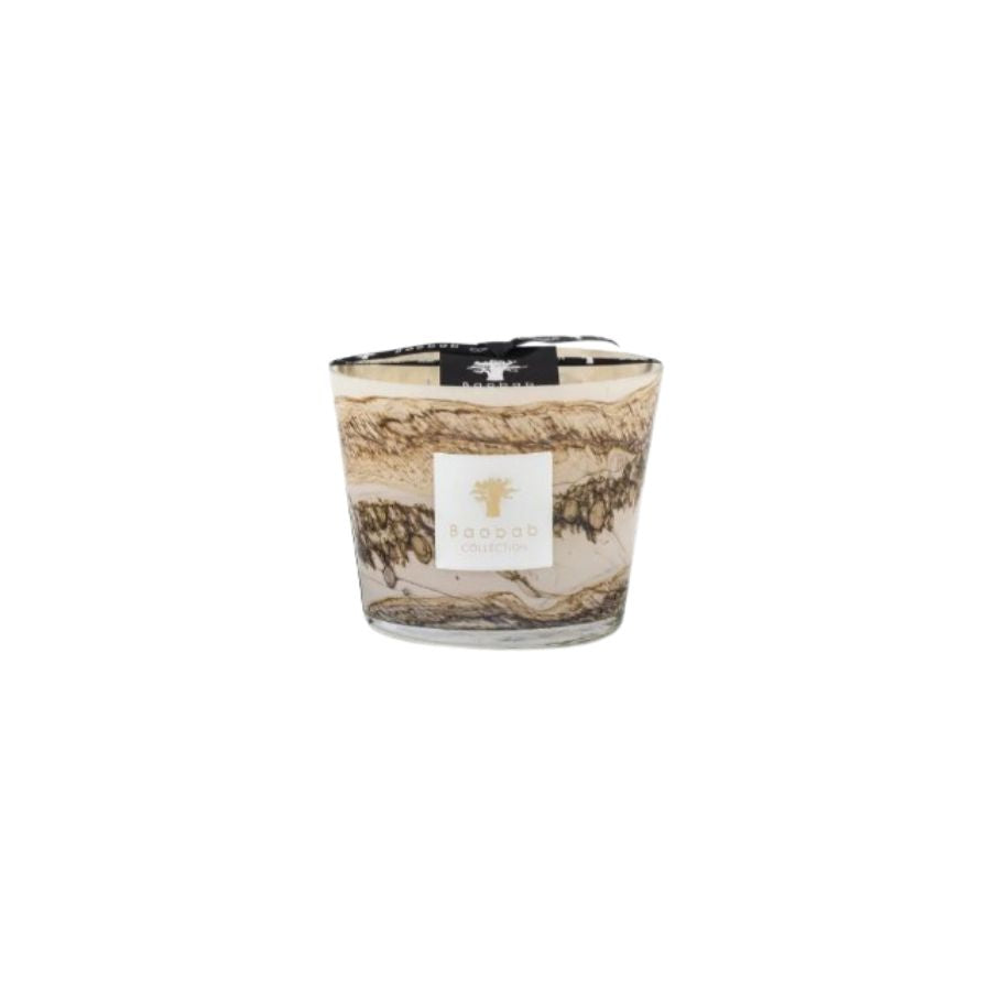 The hand-blown glasses of the Siloli candle showcase shades of beige and brown on which horizontal lines are formed with small organic and random specks. Each glass is unique, as the sandy color dissolves in the material according to the glass blower’s breath.
