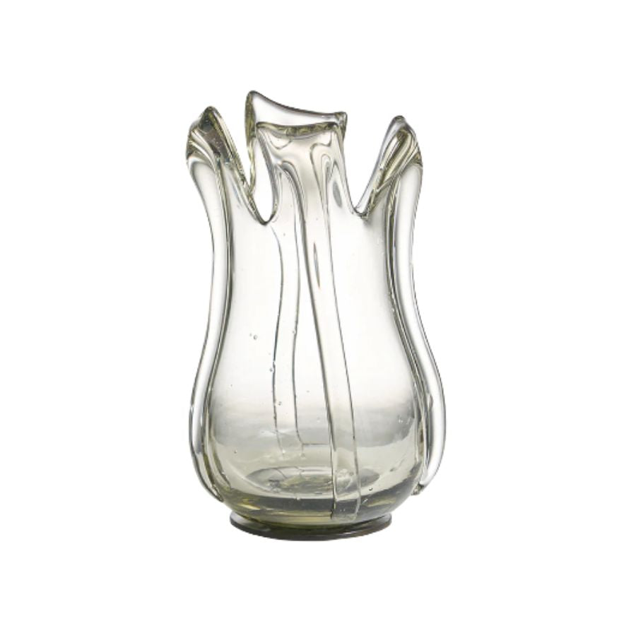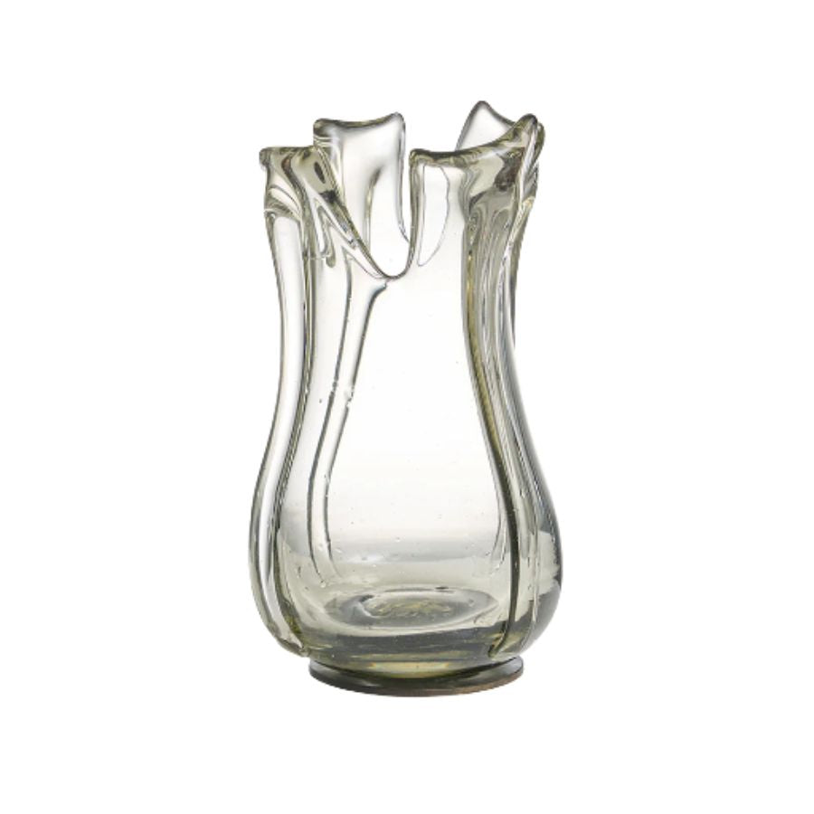 Mini version of our Four Arm hurricane: heavy mouth blown glass vase held together by four mouth blown vertical arms w/ iron stand.