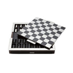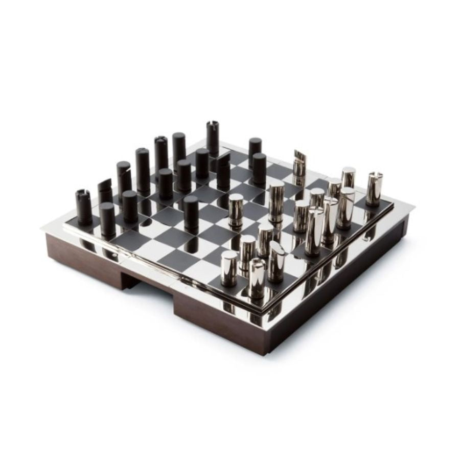 Crafted from rich walnut wood and carbon-fiber leather, our Sutton Chess Set comes with a lid for easy game storage and polished-nickel and carbon-coated game pieces.