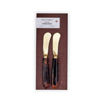A pair of stainless steel butter knives with resin handles that have a tortoise swirl pattern.