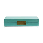 This beautiful lacquered Turquoise Jewellery Box measures 4 x 9 inches and features a gold-plated clasp and matching hinges. All of our boxes have had 20 coats of lustrous polished lacquer.